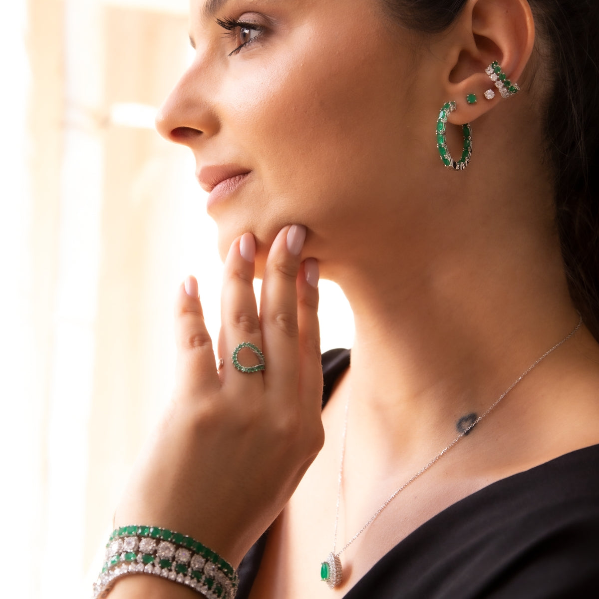 Brinco argola Manhattan esmeralda fusion ródio branco
