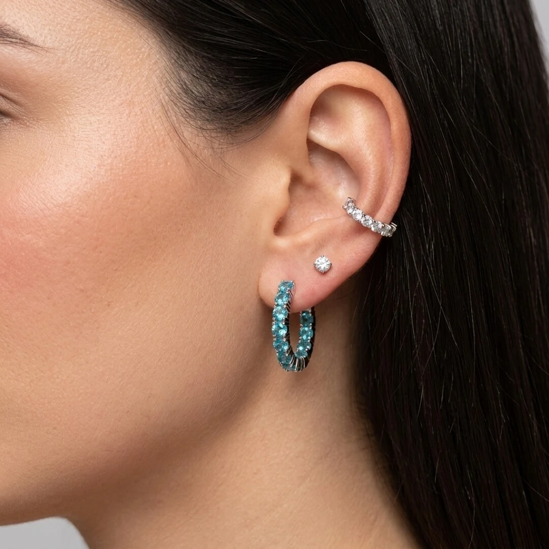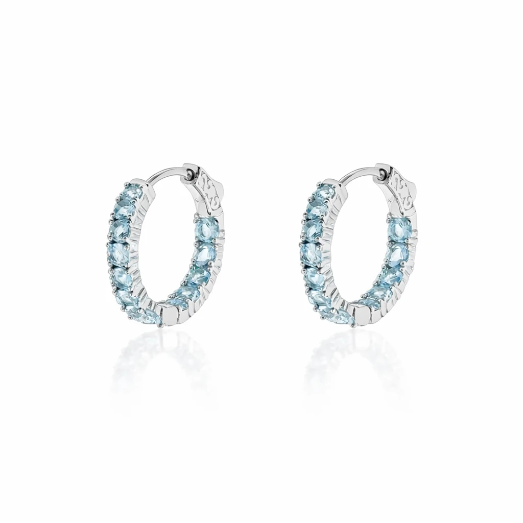 Brinco em formato de argola cravejado com zircônias de 3mm na cor água marinha
