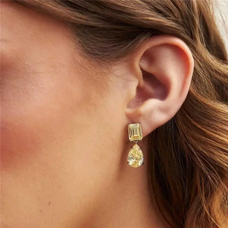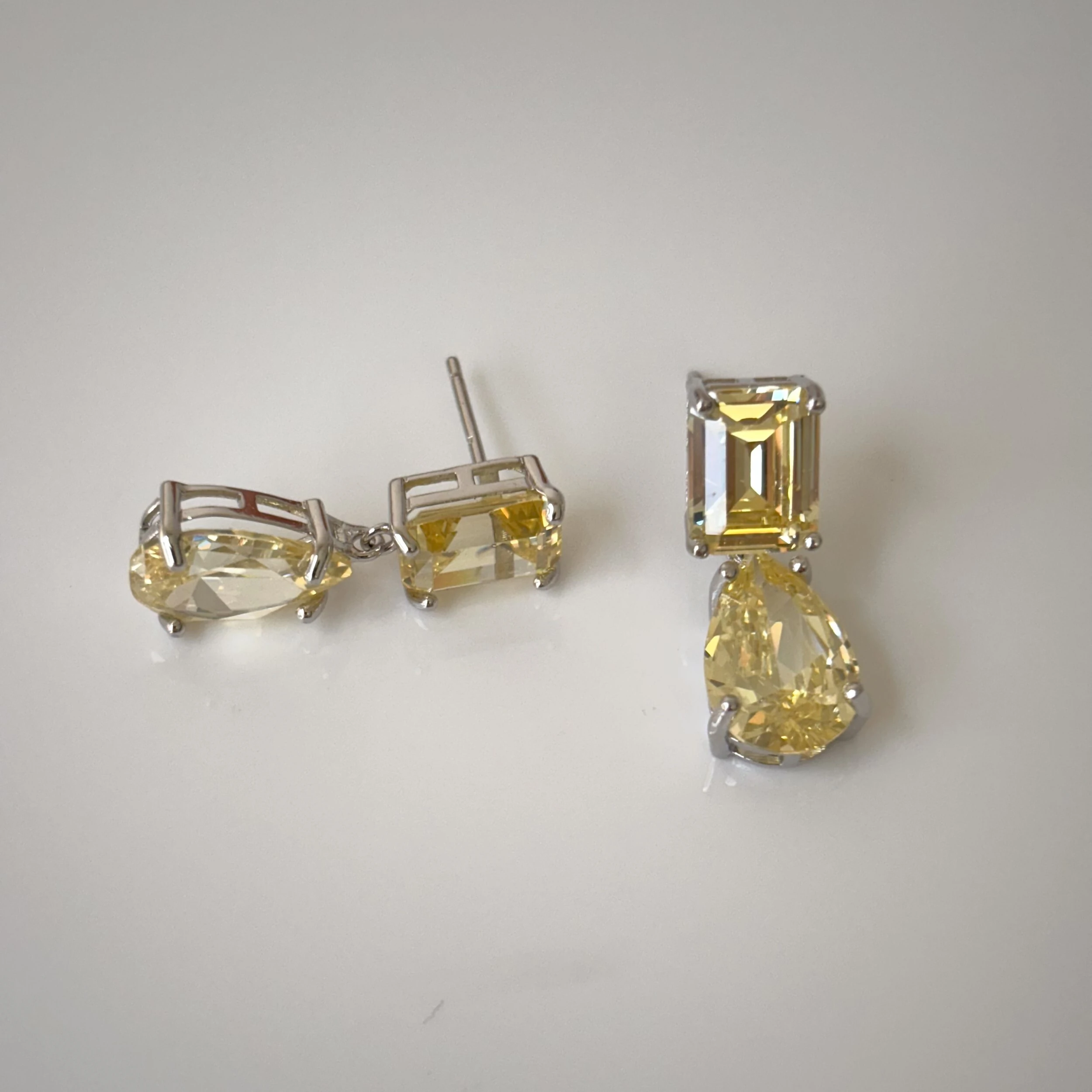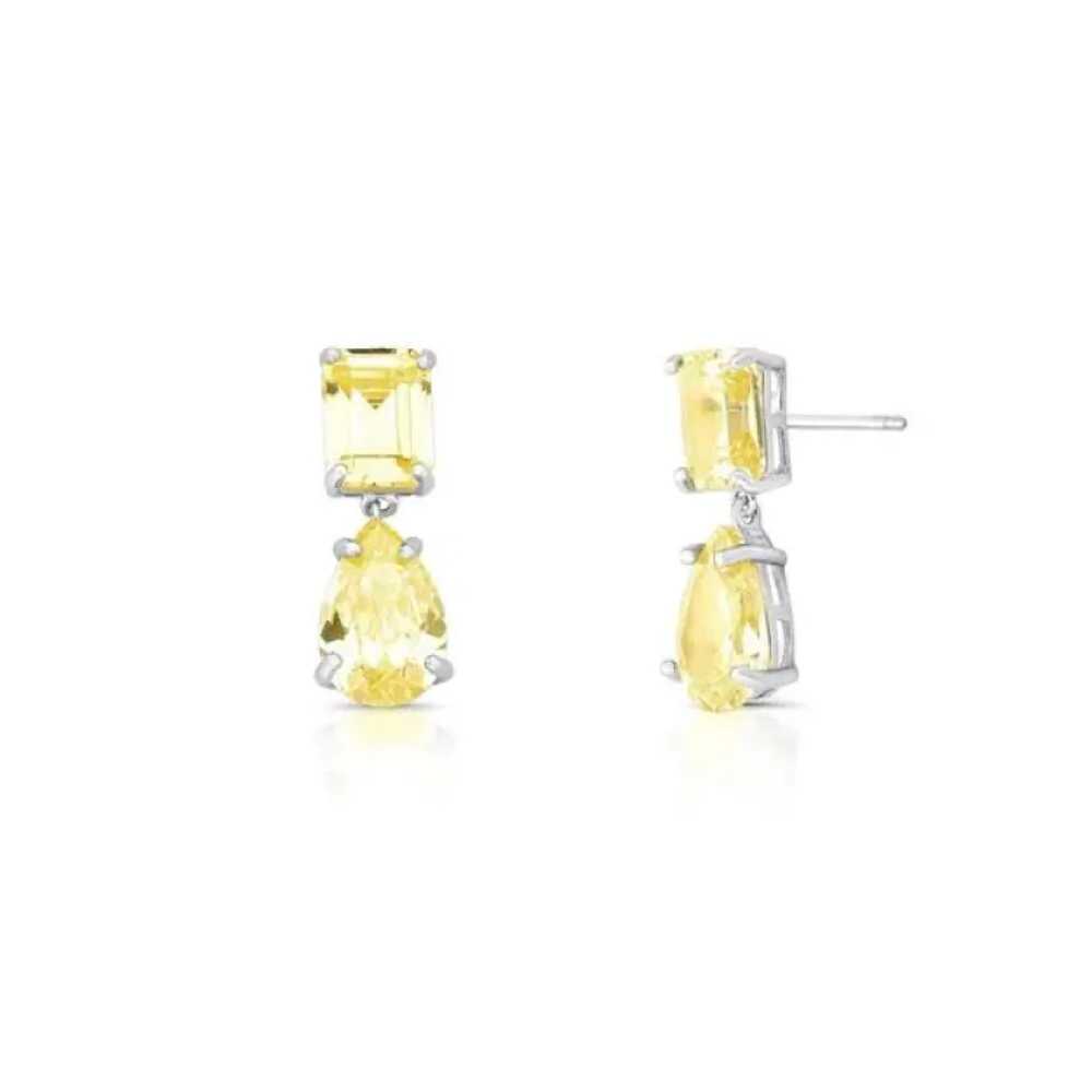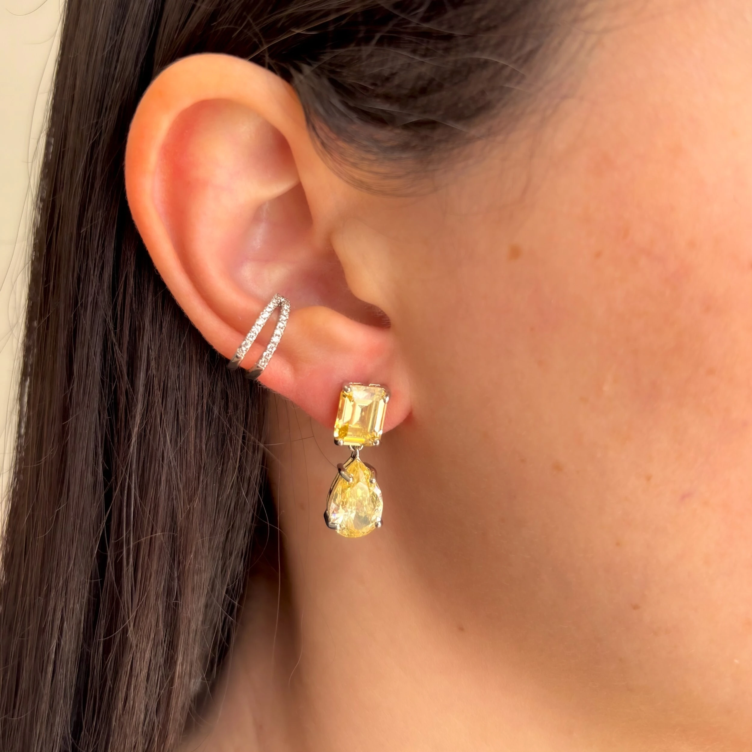Brinco em formato retangular e gota com zircônias na cor fancy yellow (amarelo)