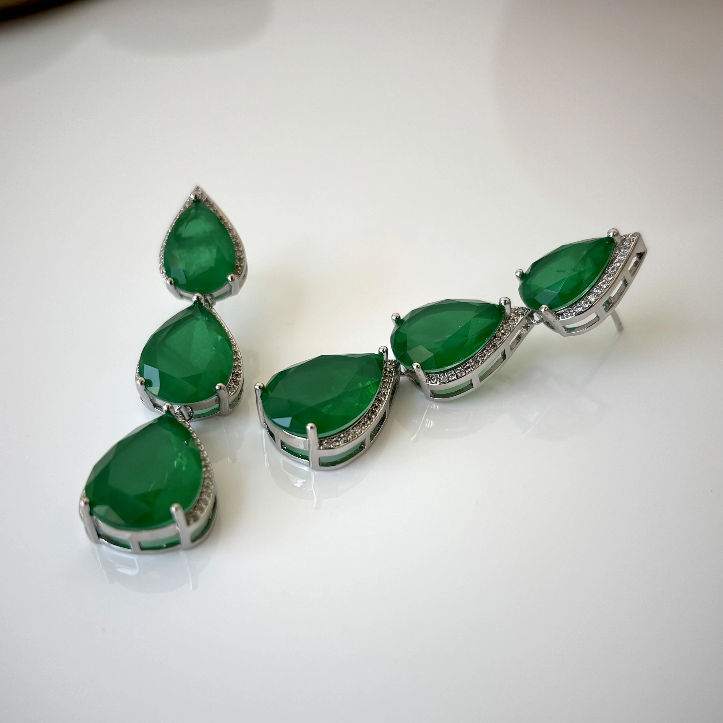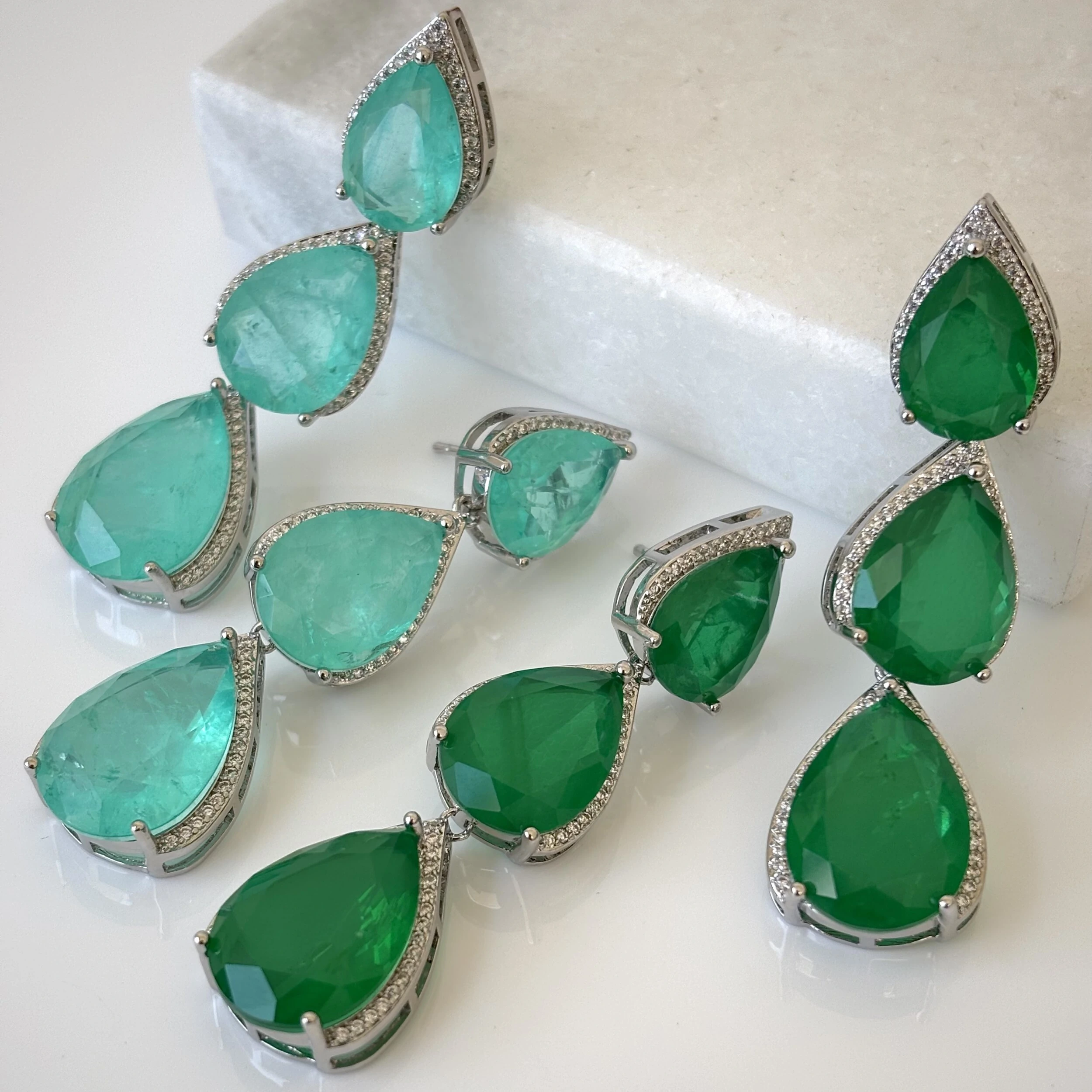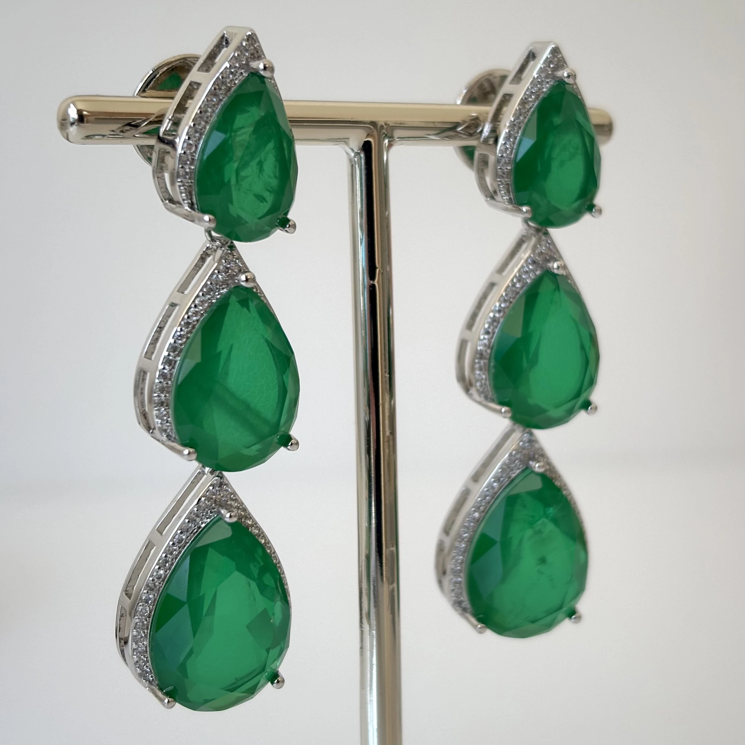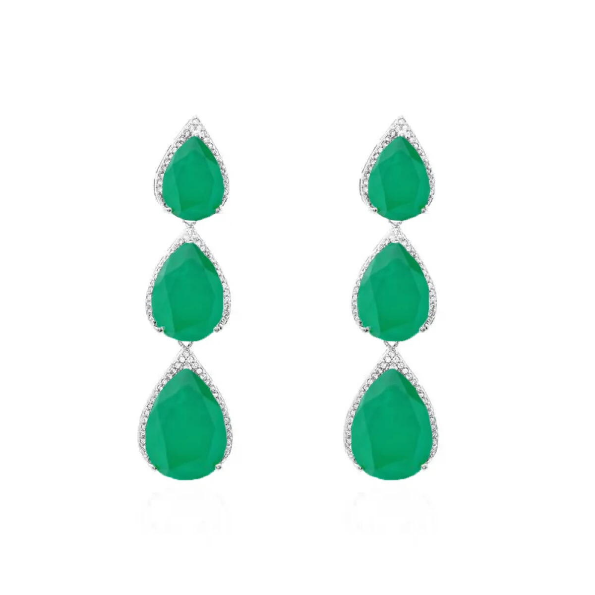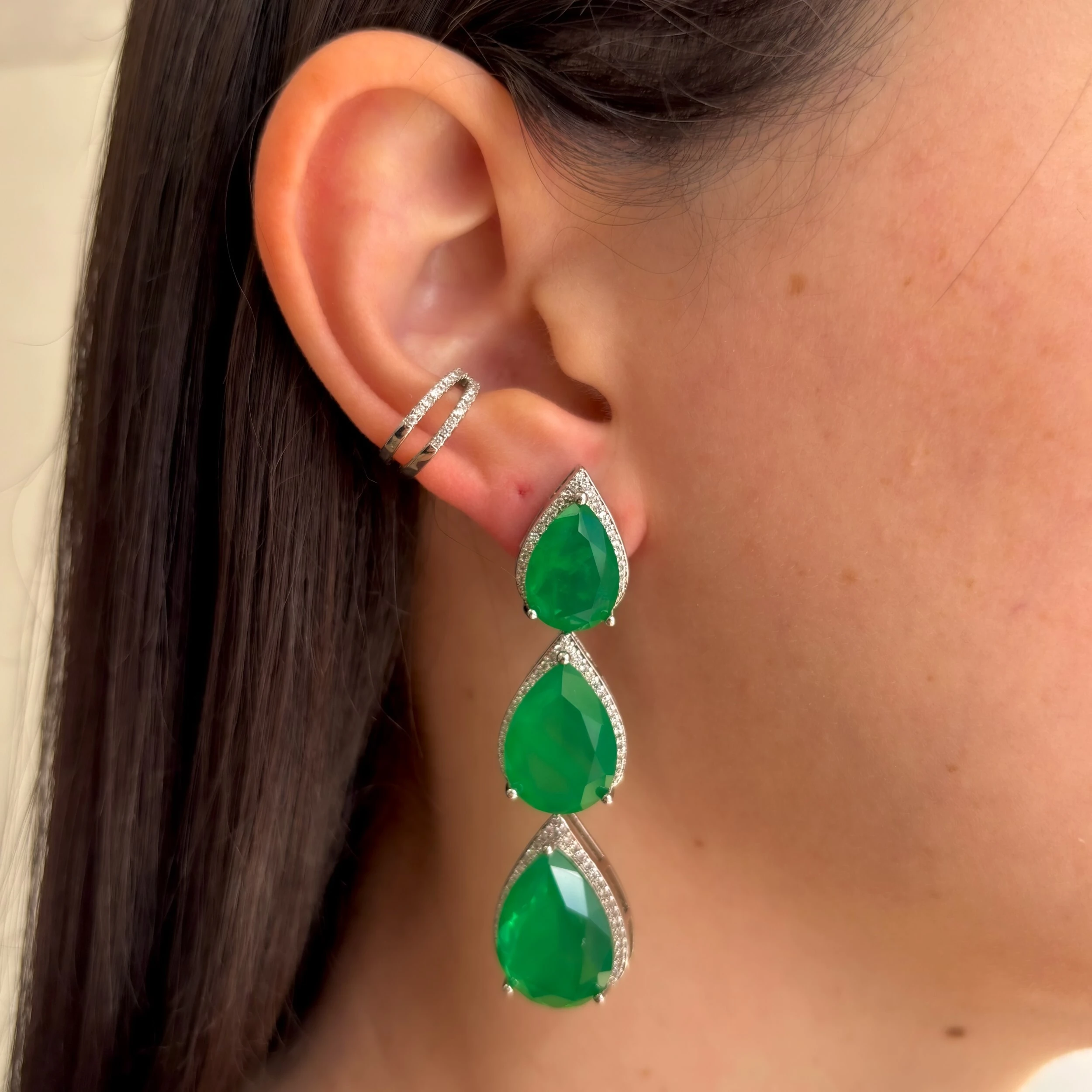 Brinco com três gotas suspensas com zircônia fusion na cor esmeralda e cravejado com zircônias brancas