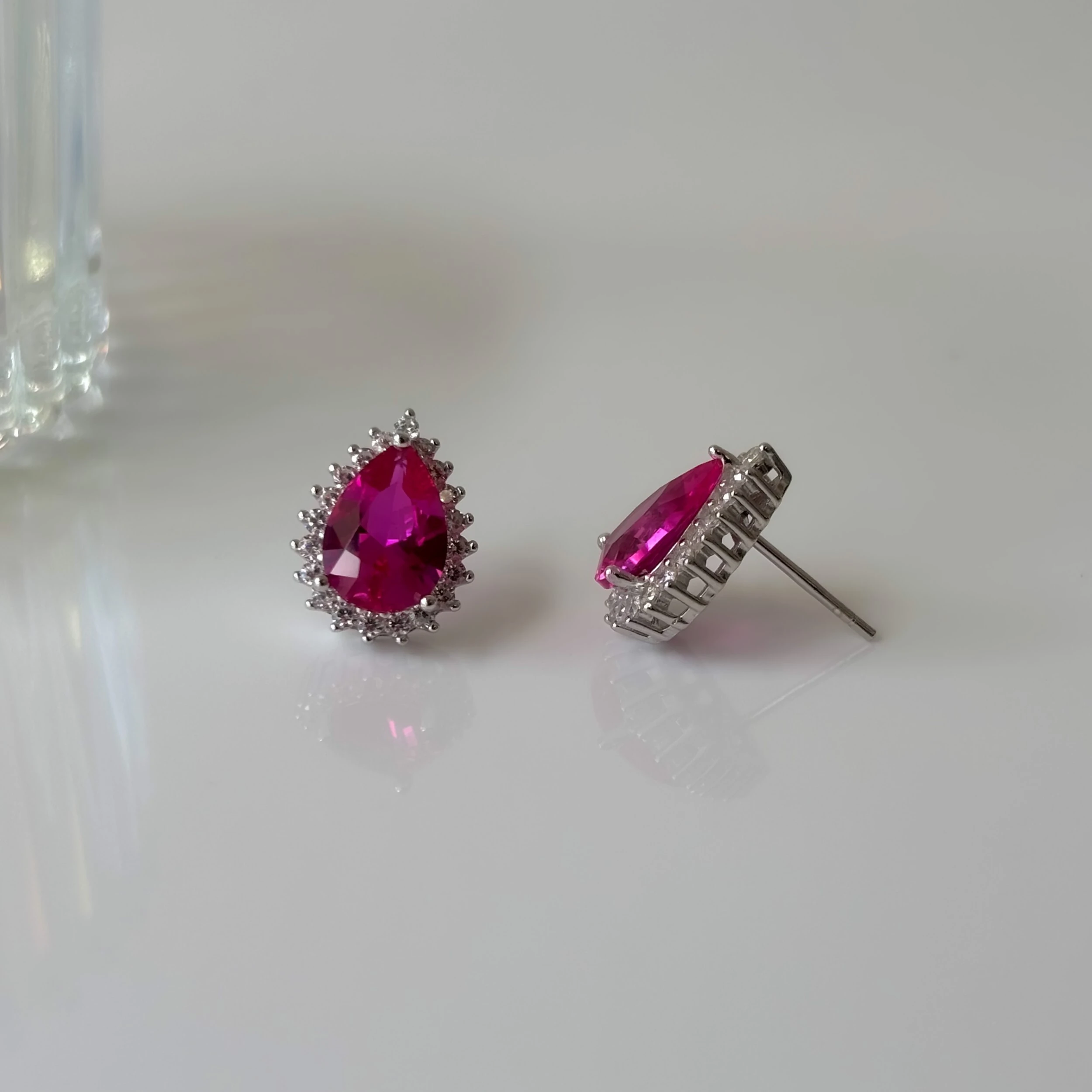 Brinco em formato de gota com zircônia central na cor turmalina pink e cravejado com zircônias brancas