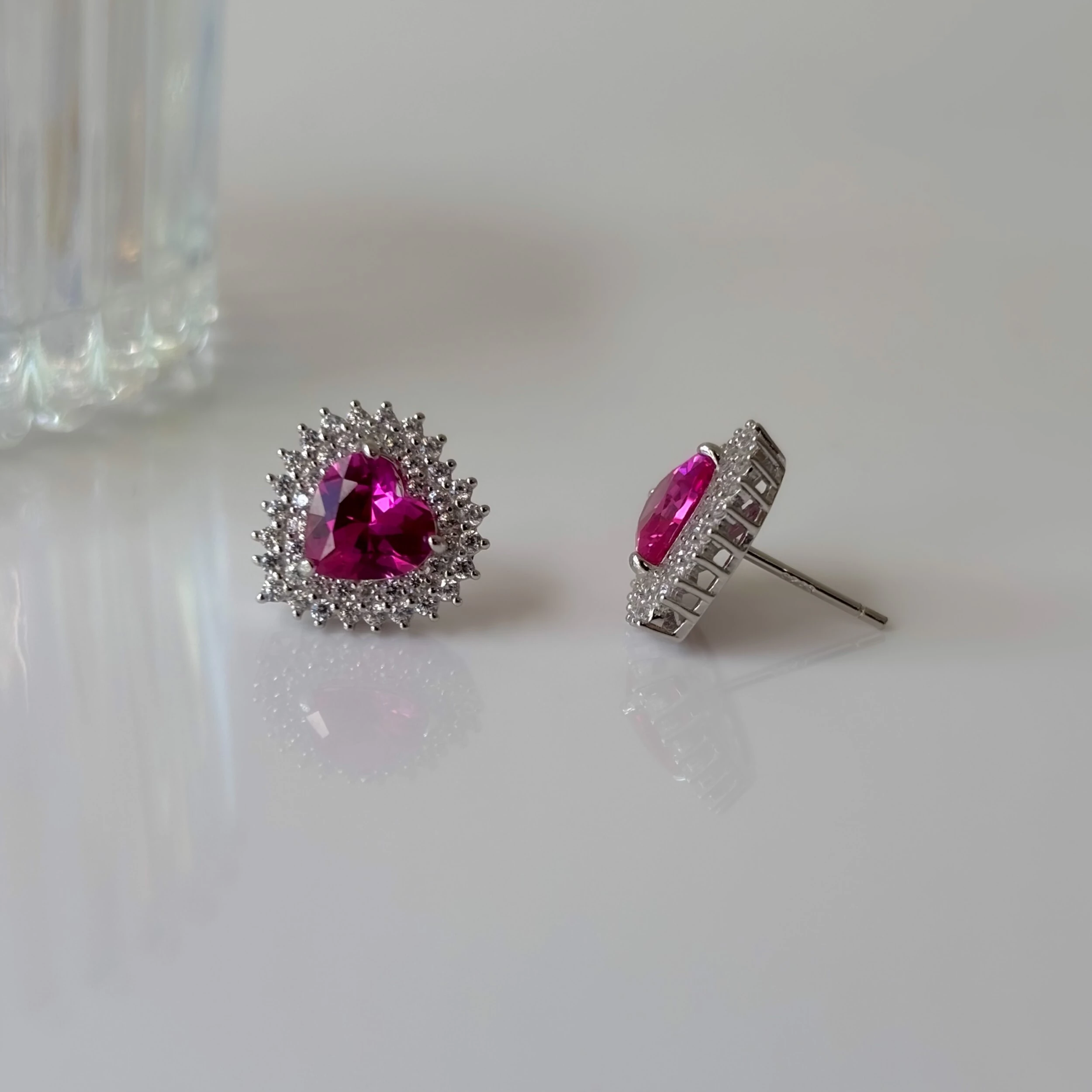 Brinco em formato de coração com zircônia na cor turmalina pink e cravejado com zircônias brancas