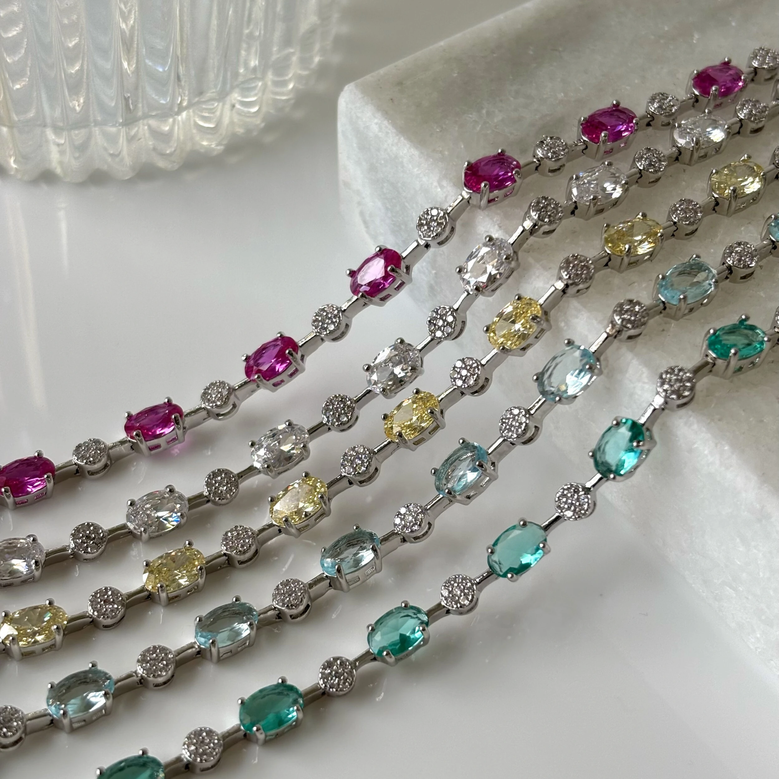 A Pulseira Riviera Anna traz zircônias ovais na cor fancy yellow intercaladas por pontos de zircônias brancas, criando um contraste luminoso e elegante no pulso. O tom amarelo suave ilumina a peça sem pesar, enquanto o banho de ródio branco deixa o acabamento mais claro, moderno e sofisticado. É aquele tipo de joia que funciona tanto sozinha quanto em mix, com presença na medida certa.
