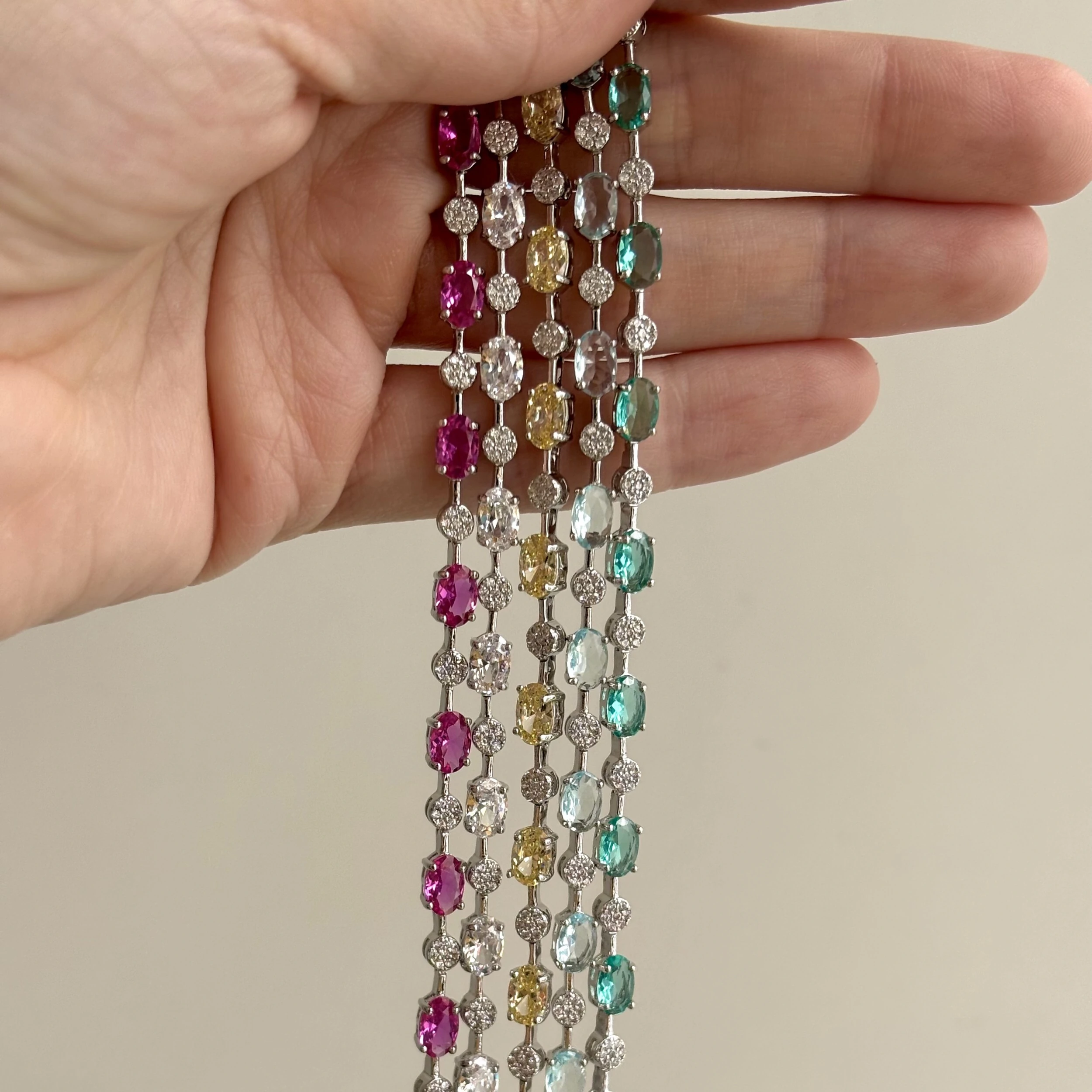 Pulseira riviera com zircônias ovais na cor água marinha e cravejado com pontos de zircônias brancas