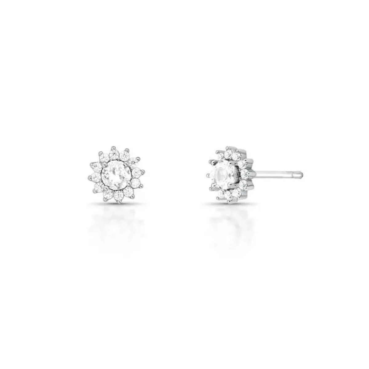 Brinco redondo com zircônia central branca e cravejado com zircônias brancas