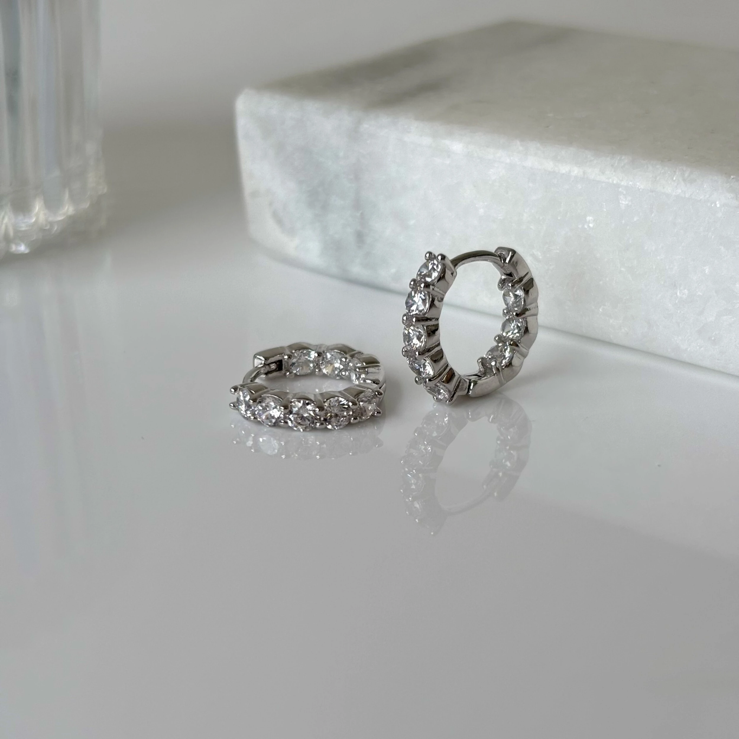 Brinco meia argola Kim zircônias esmeralda colombiana ródio branco