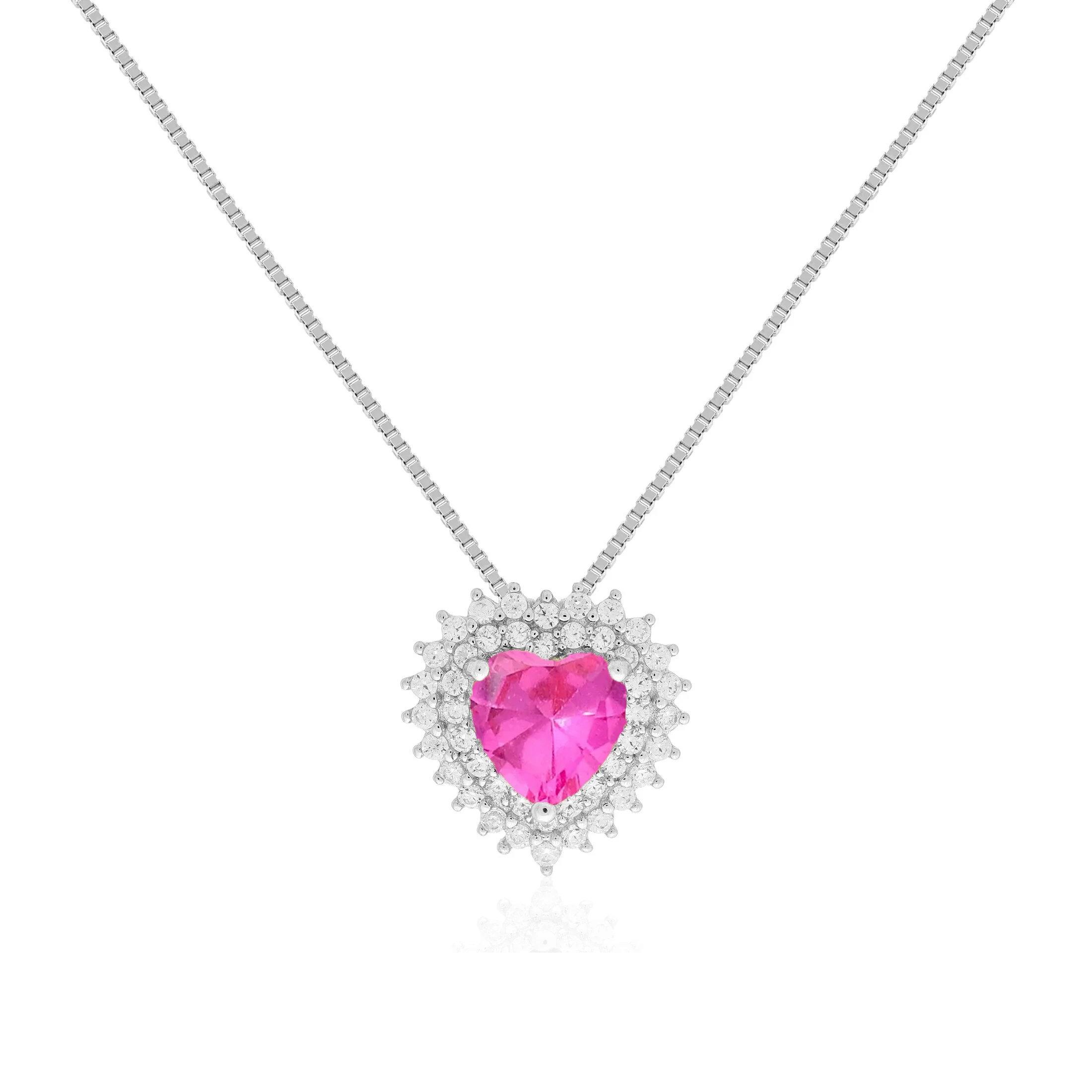 Colar com pingente de coração com zircônia na cor turmalina pink e cravejado com zircônias brancas