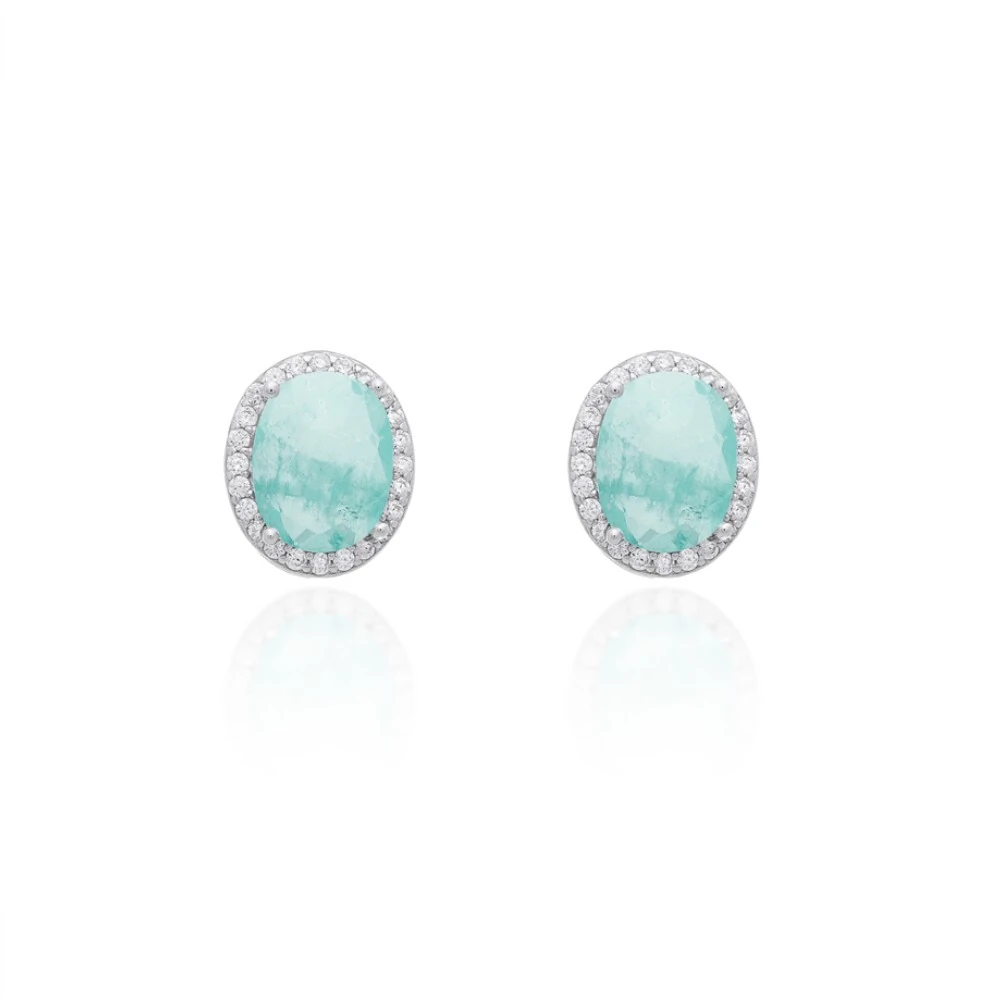 Brinco em formato oval com zircônia fusion na cor esmeralda colombiana e cravejado com zircônias brancas