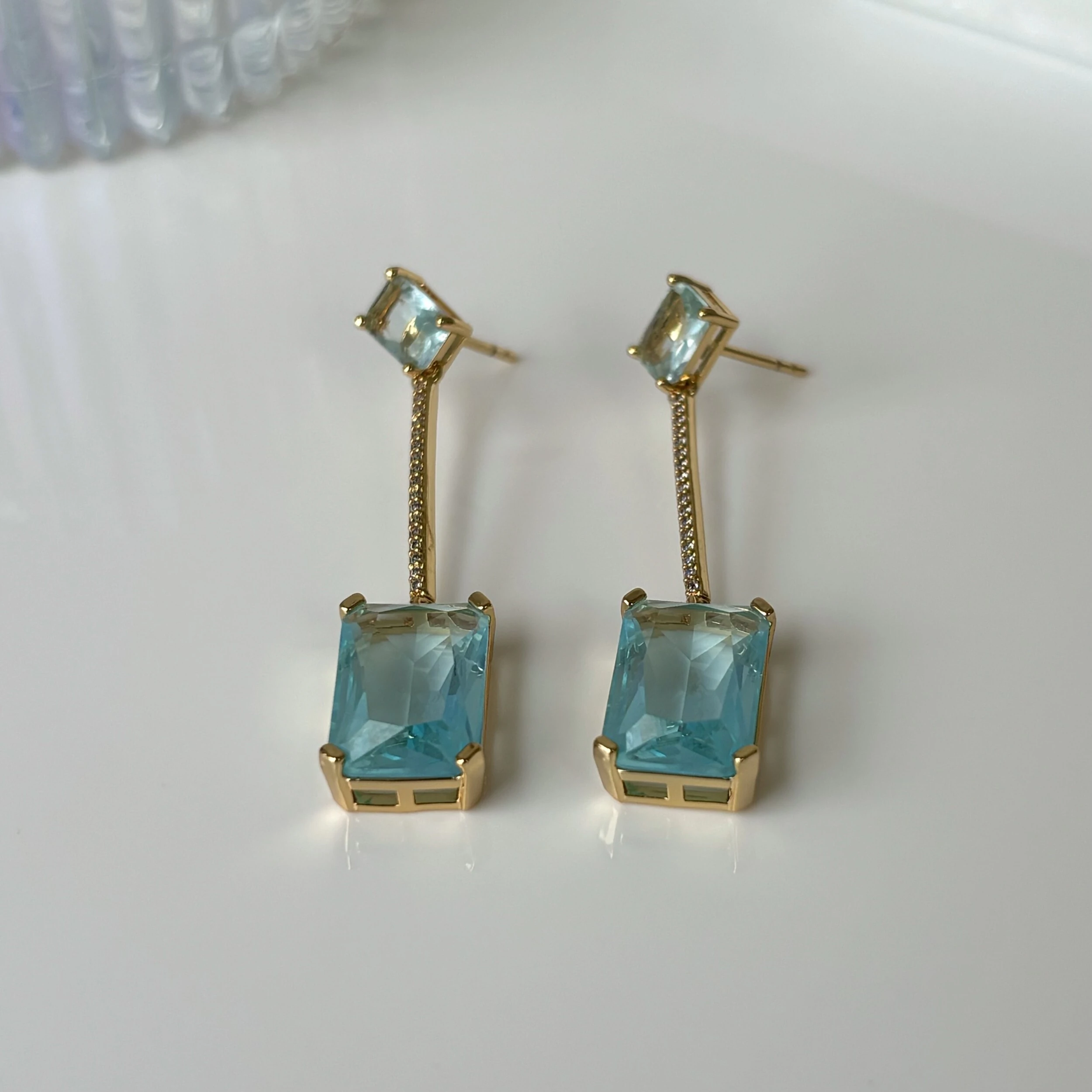 Brinco com zircônias retangulares na cor água marinha e cravejado com zircônias brancas