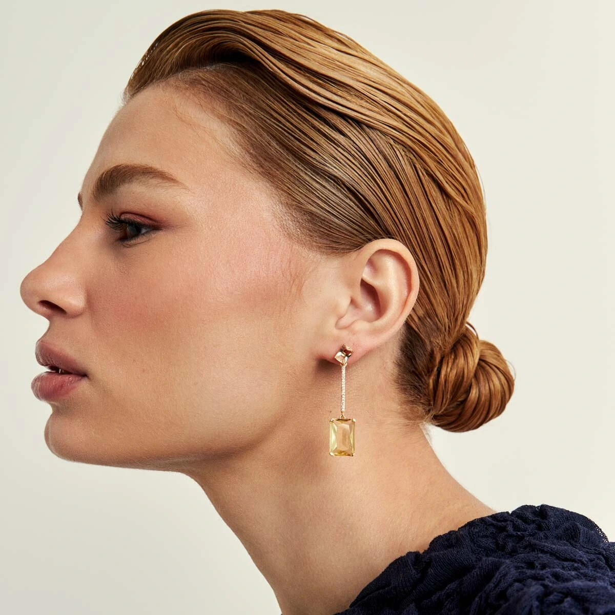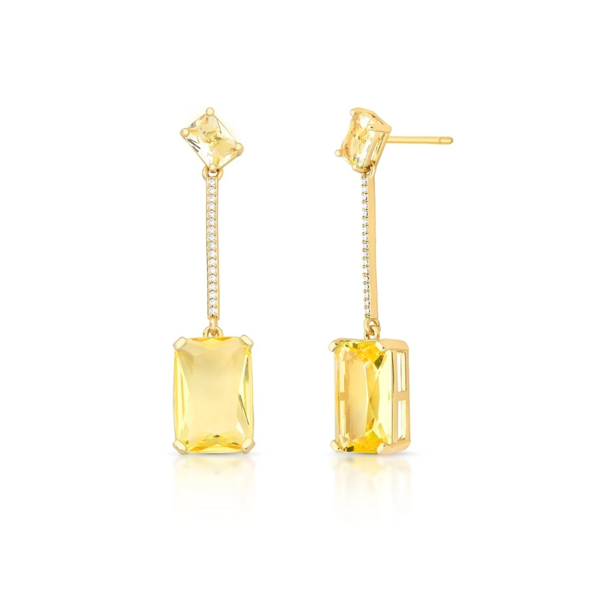 Brinco com zircônias retangulares na cor fancy yellow (amarelo) e cravejado com zircônias brancas