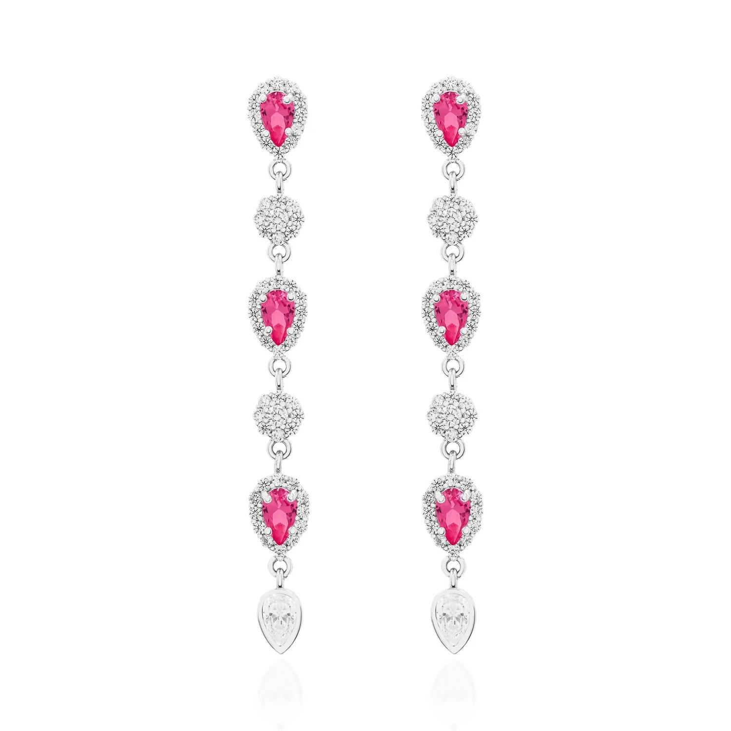 Brinco cravejado com zircônias brancas e zircônias em formato de gota na cor turmalina pink