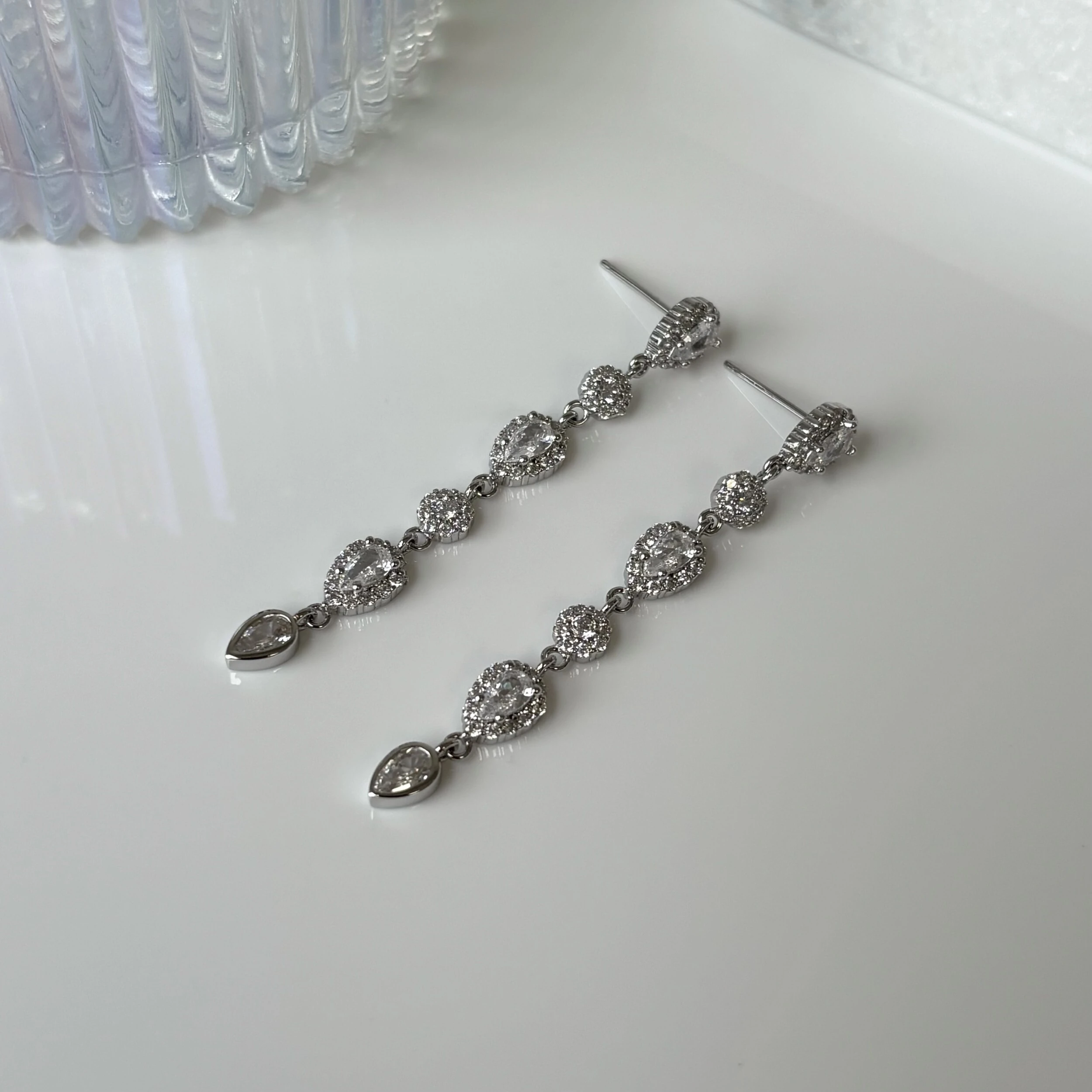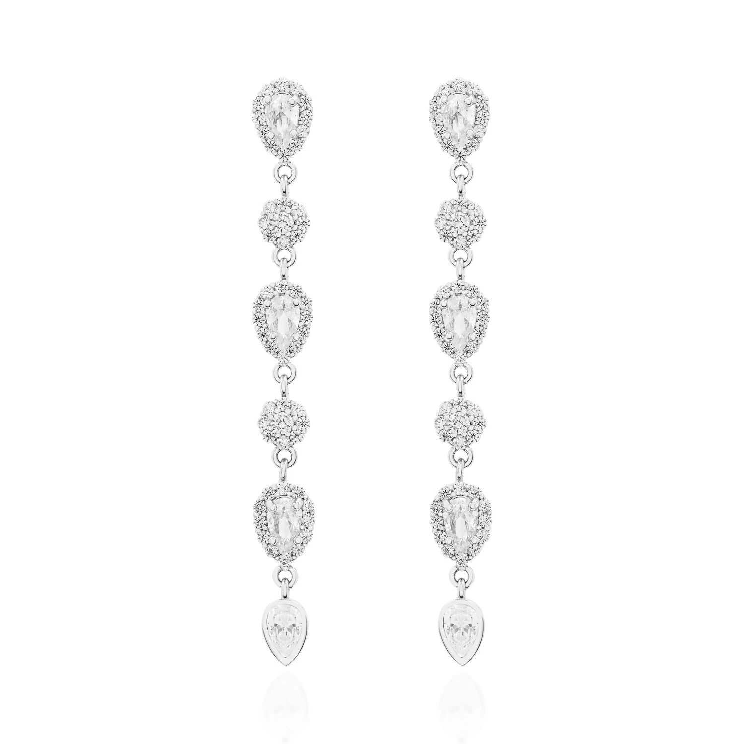 Brinco cravejado com zircônias brancas e zircônias em formato de gota na cor branca