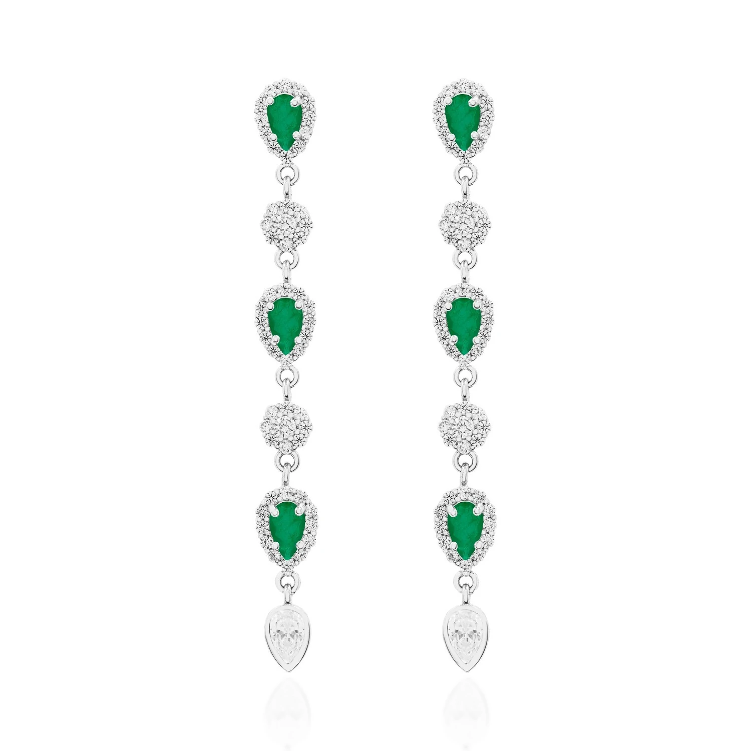 Brinco cravejado com zircônias brancas e zircônias fusion em formato de gota na esmeralda