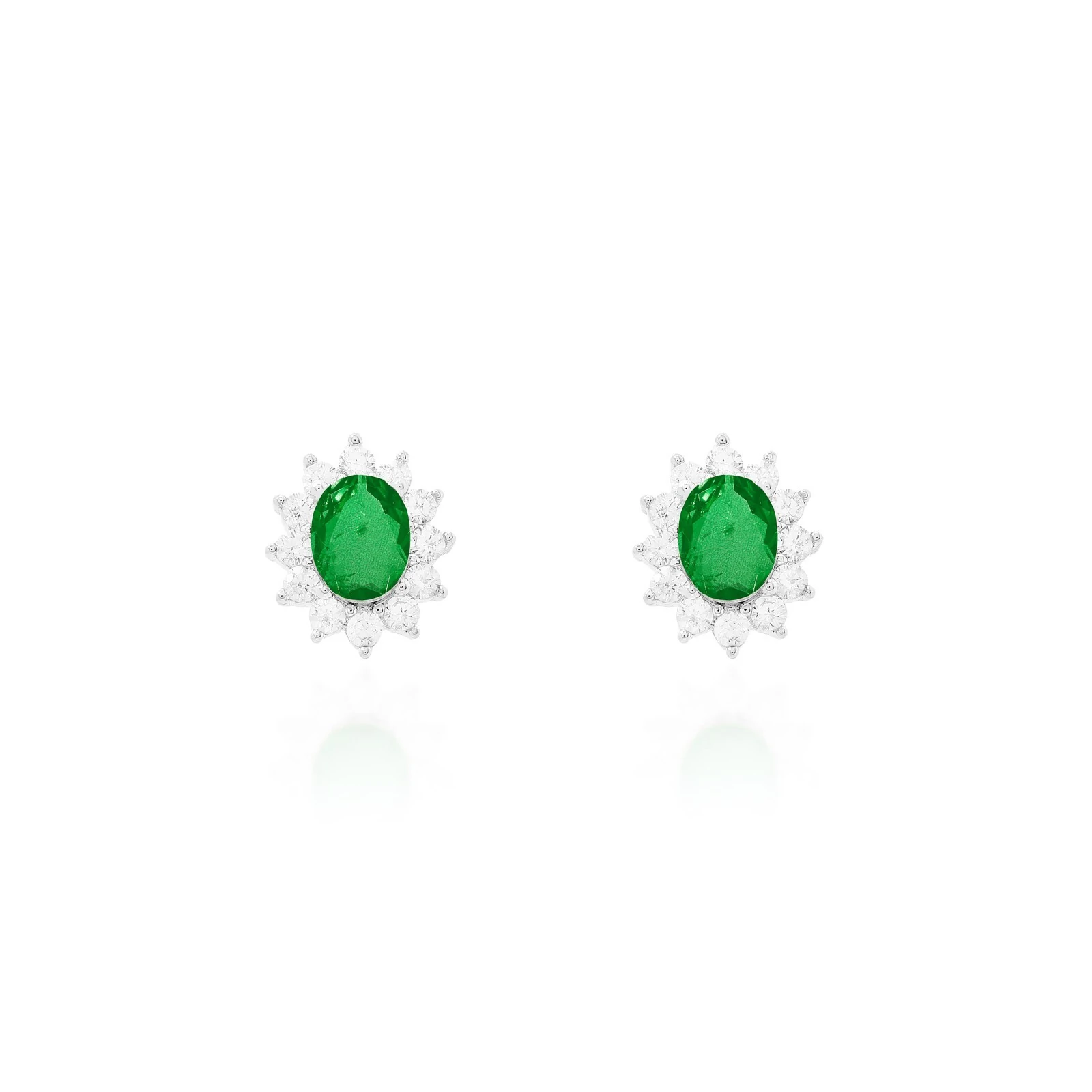 Brinco oval com zircônia fusion central na cor esmeralda e cravejado com zircônias brancas