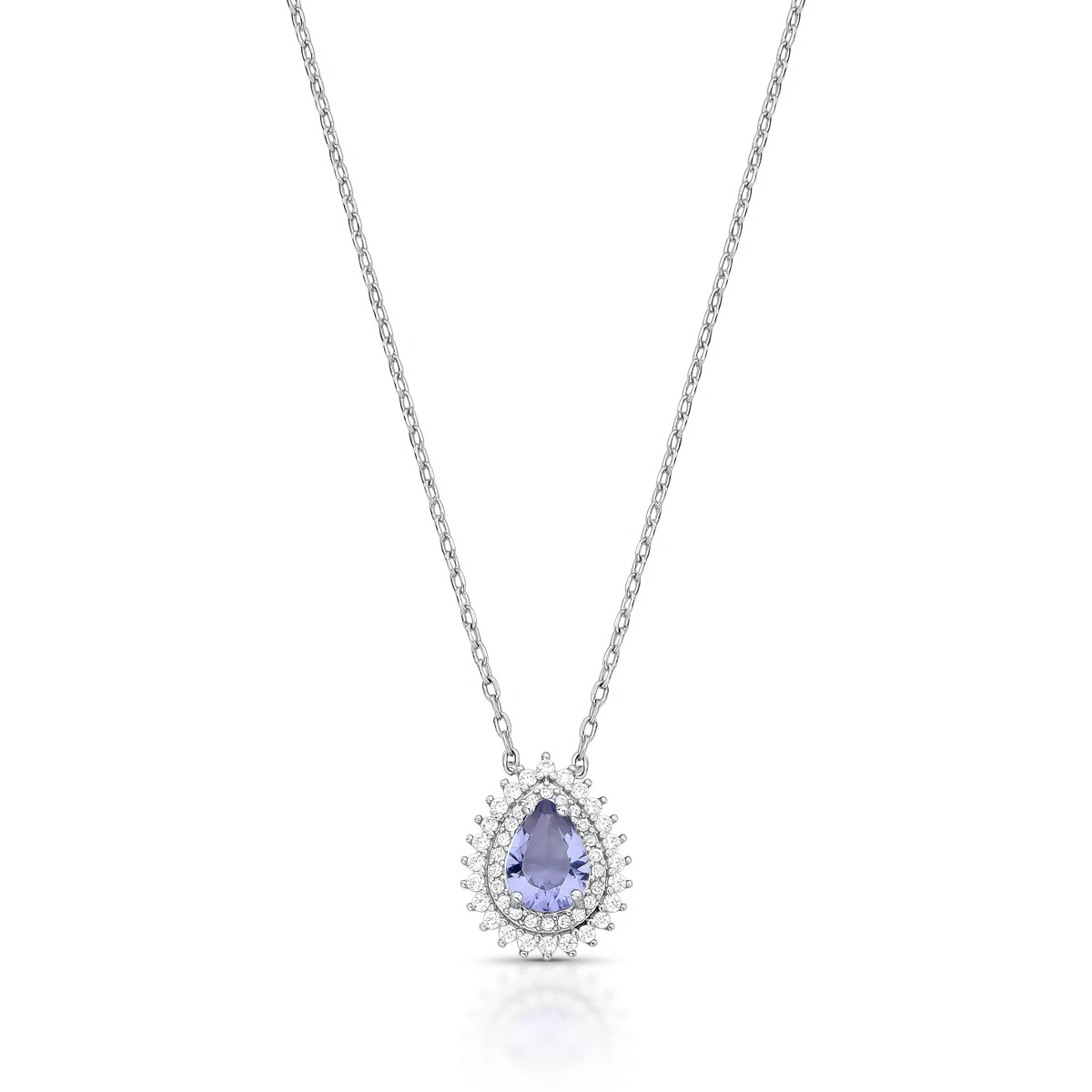 Colar com pingente em formato de gota com zircônia central na cor tanzanita e cravejado com zircônias brancas