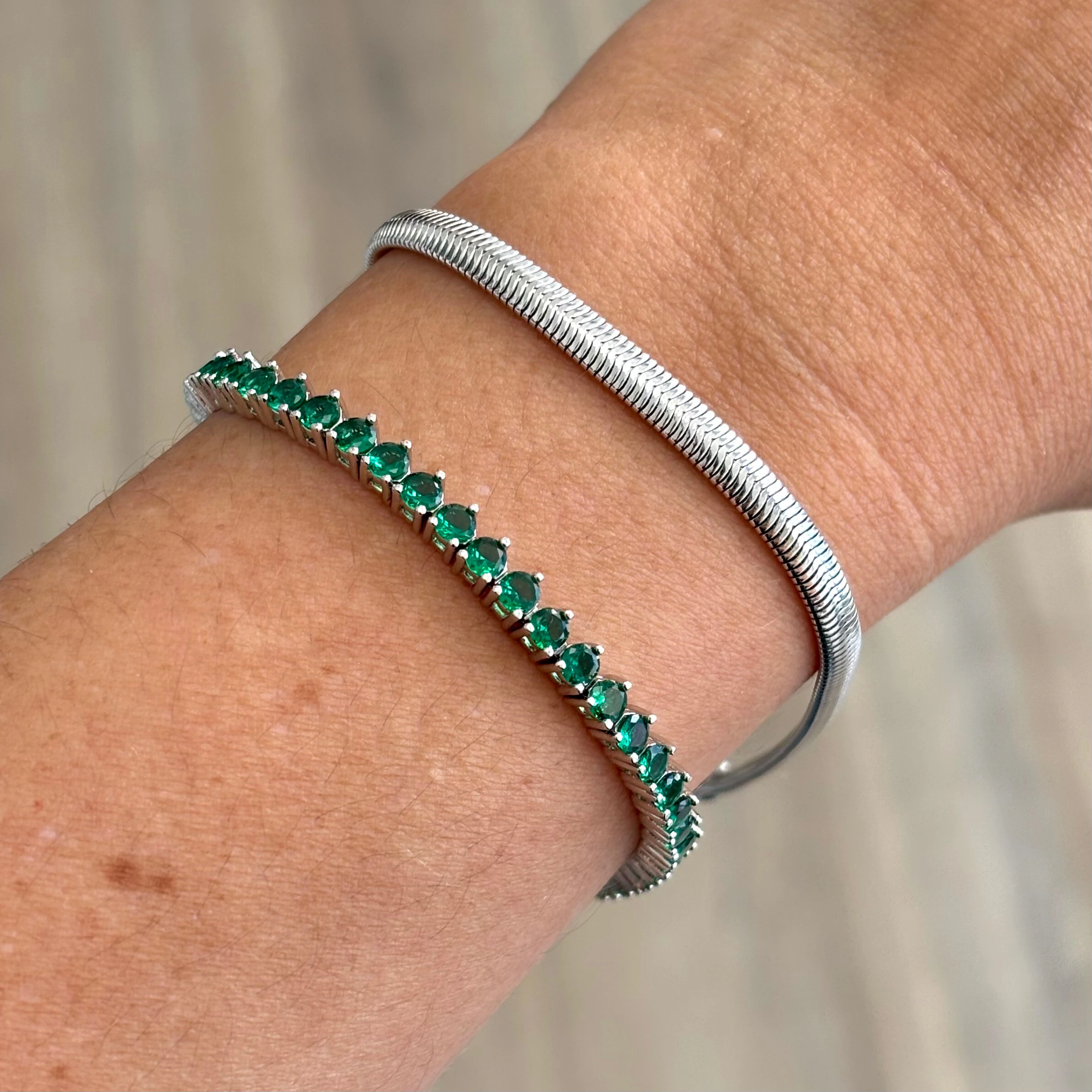 Pulseira riviera cravejada com zircônias na cor esmeralda. Modelo de 3 garras, com zircônias de 3mm e fecho gaveta com trava.