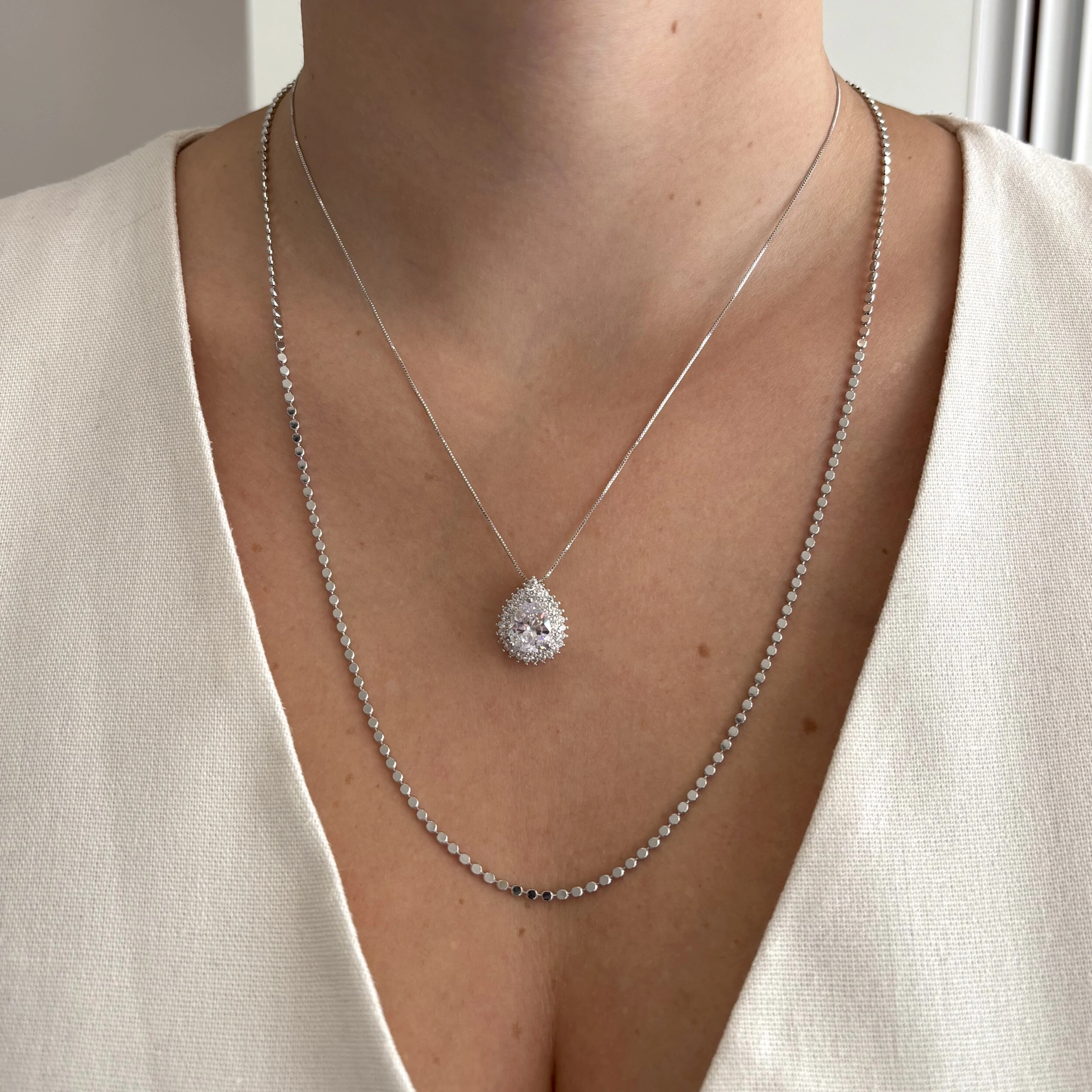 Colar com pingente em formato de gota com zircônia central na cor branca e com dupla cravação de zircônias brancas