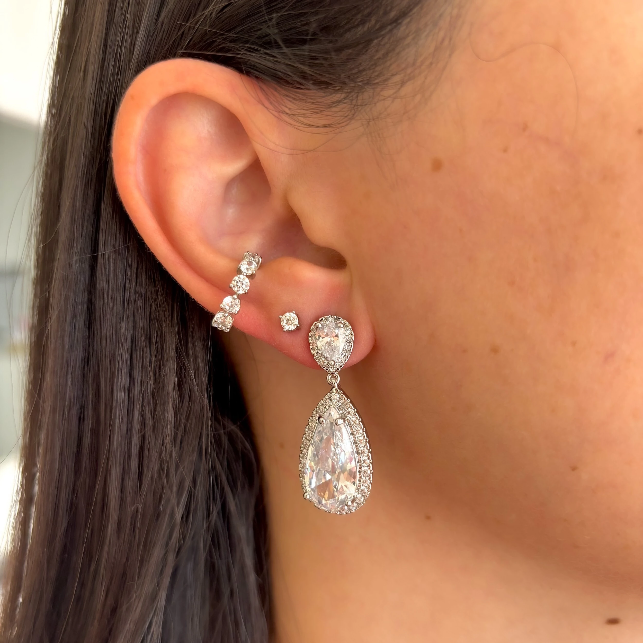 Brinco em formato de gota dupla com zircônias brancas