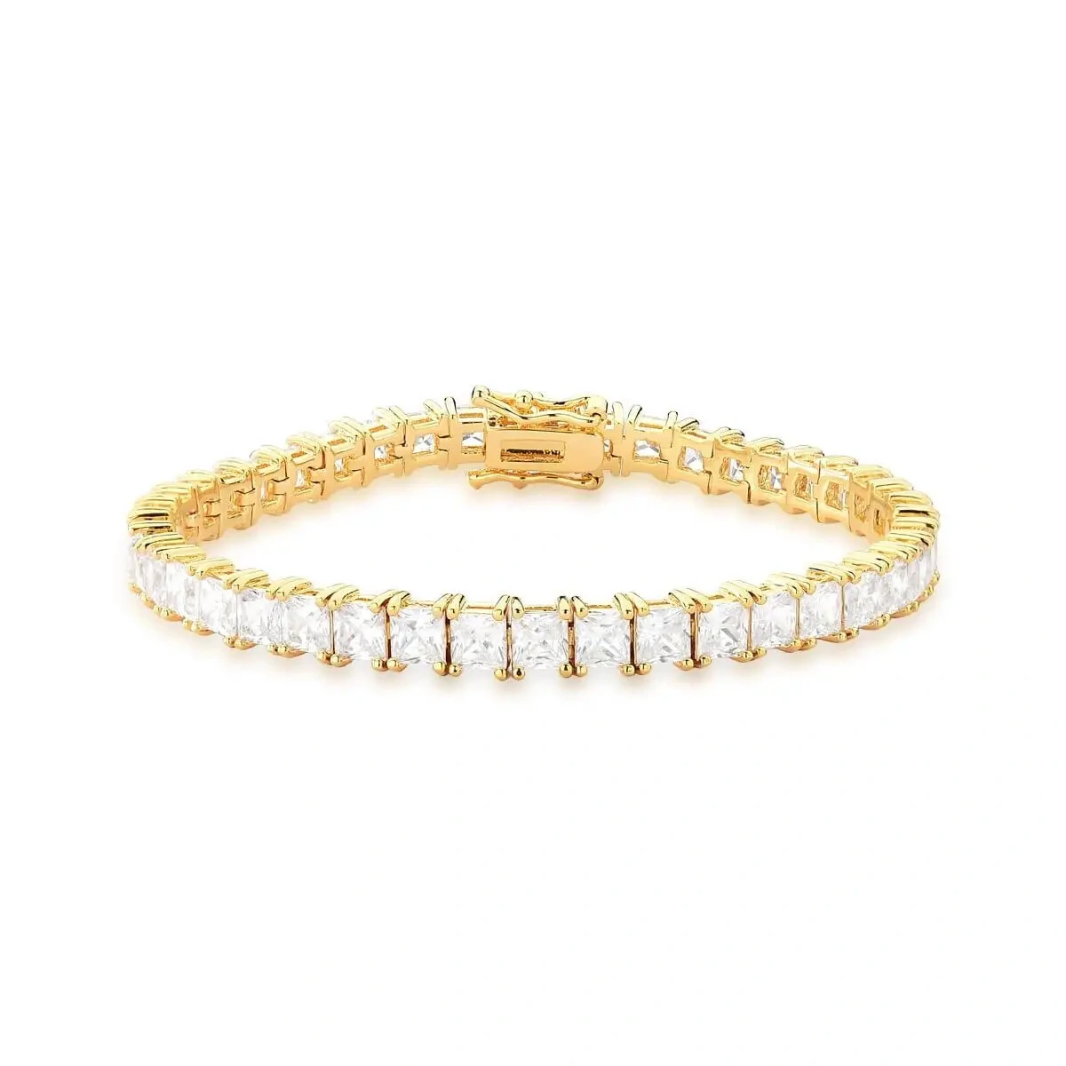 Pulseira riviera cravejada com zircônias brancas. Modelo de 4 garras, com zircônias de 3mm e fecho gaveta com trava.