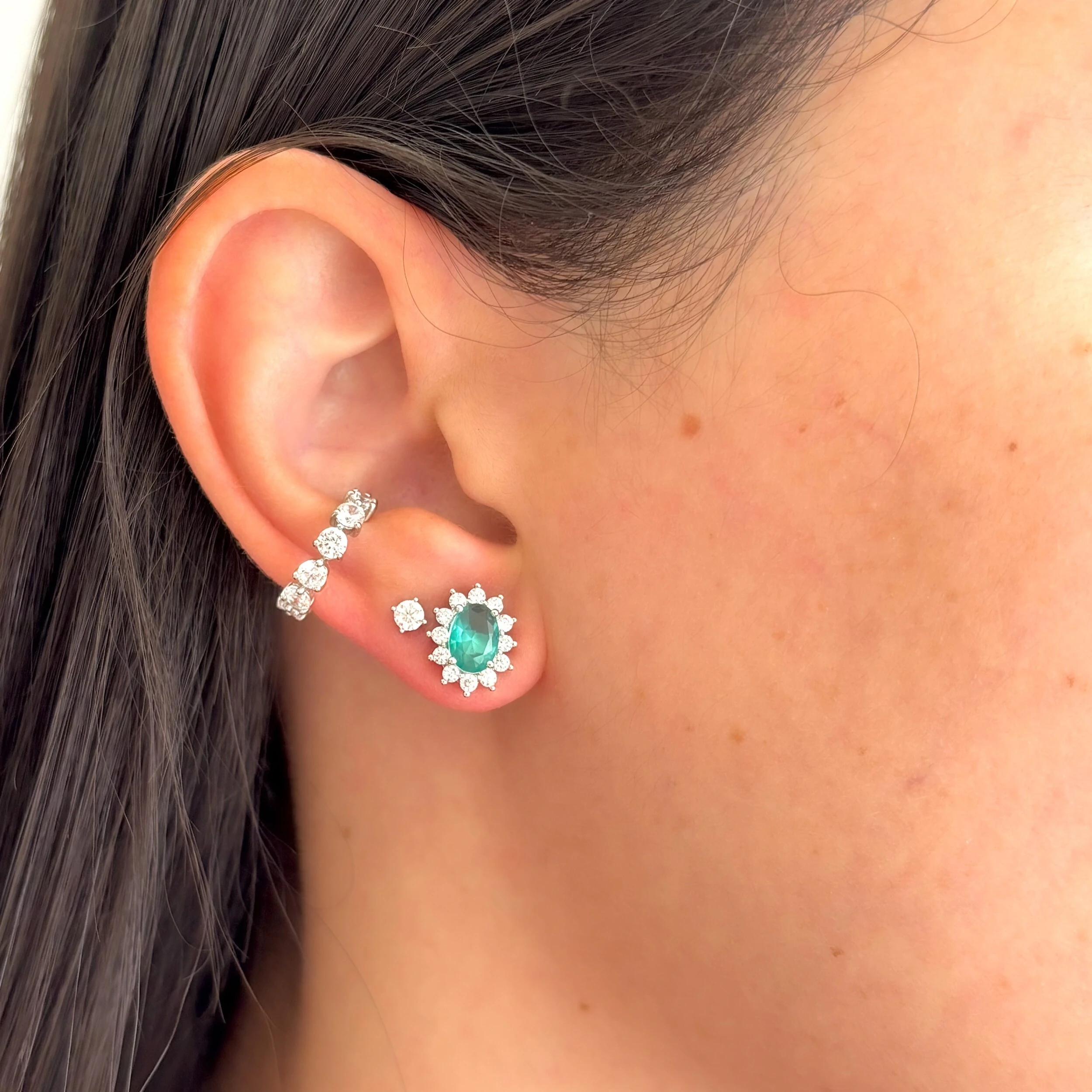 Brinco oval com zircônia na cor esmeralda colombiana cravejado com zircônias brancas