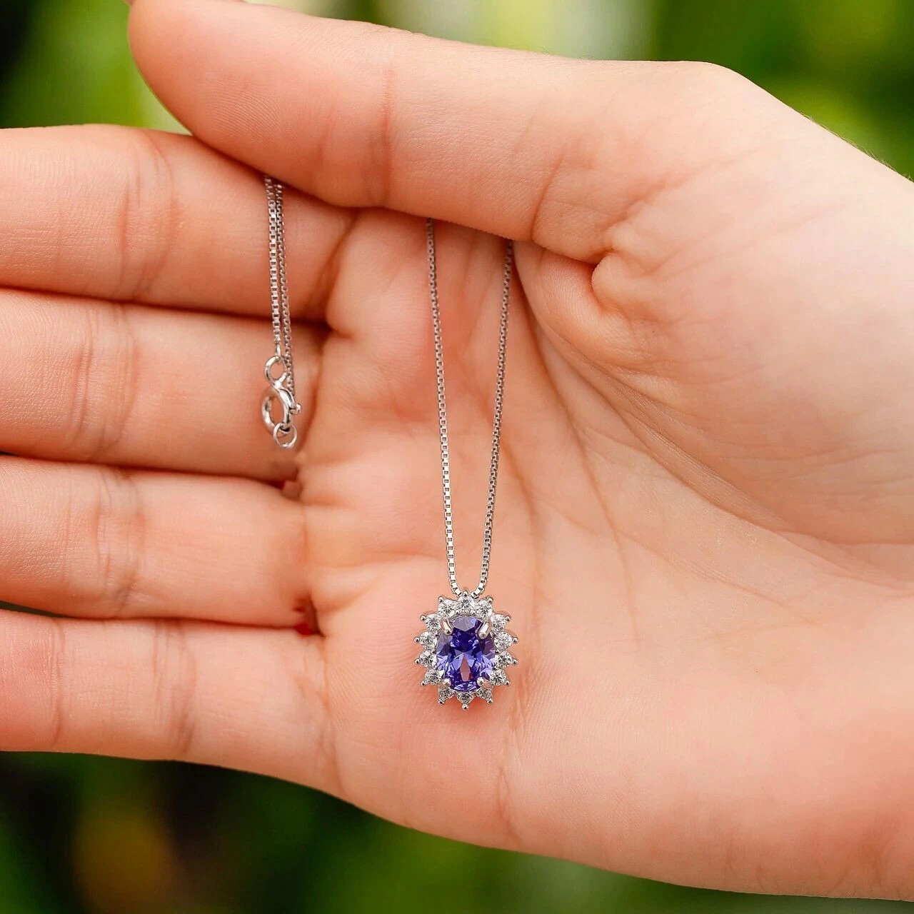 Colar com pingente oval de zircônia na cor tanzanita cravejado com zircônias brancas
